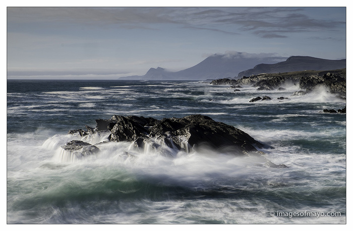 here is an image from one of my favourite locations on Achill island, its a spot I find it impossible to drive by without stopping for a picture, I have photographed it it all different lights, and with different effects. sometimes using a high shutter speed to freeze the water, sometimes using long exposures of 30 seconds to completely blur and soften the water. this one is taken at a shutter speed of 1.5 seconds which is just enough , I think, to show motion but keep the shape of the waves.