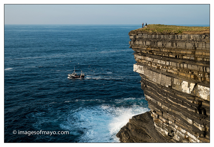 This image was taken a week ago while on a one to one training course with Caroline from Limerick. We had really finished and were just taking a walk along the top of the cliffs at Downpatrick Head, we stopped and were taking pictures of the couple who were standing perilously close to the edge ( of course we were just as close on our edge!! ) When without warning the fishing boat came around the edge of the cliff adding further to the interest and the scale of the picture.