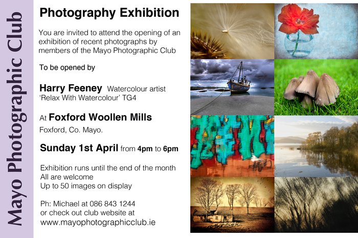 If you are looking for something interesting to do this afternoon, why not come along to the opening of an Exhibition of photographs by members of the Mayo Photographic Club ( of which I am one !) The Opening is at 4pm at the Foxford Woolen Mills and will run for a month.