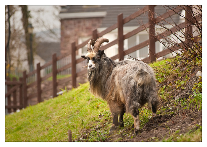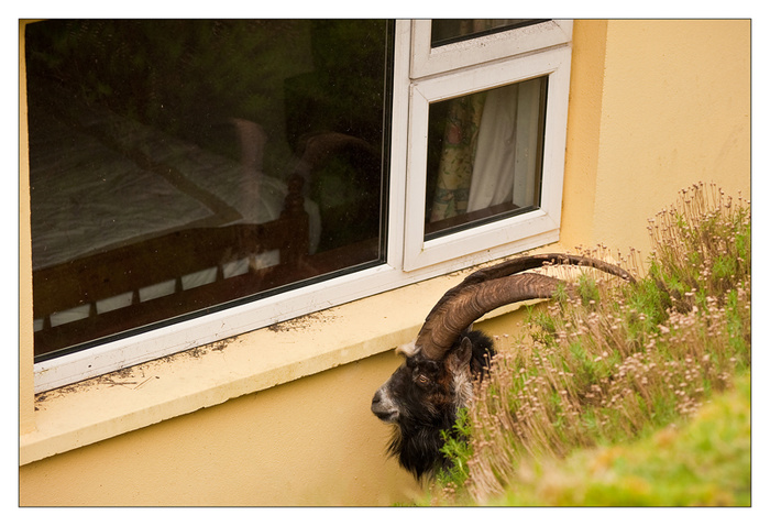 I was in Mulranny this morning making the final arrangements for a Landscape photography weekend I will be hosting on 11th May. ( there are still places available!) Apart from fantastic scenery Mulranny is also famous for its herd of "Old Irish goats" The goats are wild and live for the most part in the hills above Mulranny. They are a bit of a tourist attraction and are considered a great asset for the area, though you can imagine that their relationship with the people of Mulranny is not always a positive one. The goats can occasionally be seen in the village. Today as we left Mulranny I spotted a couple of them and stopped to take their pictures, one was in the front garden of a house and was munching away, and I dont think it was weeding!