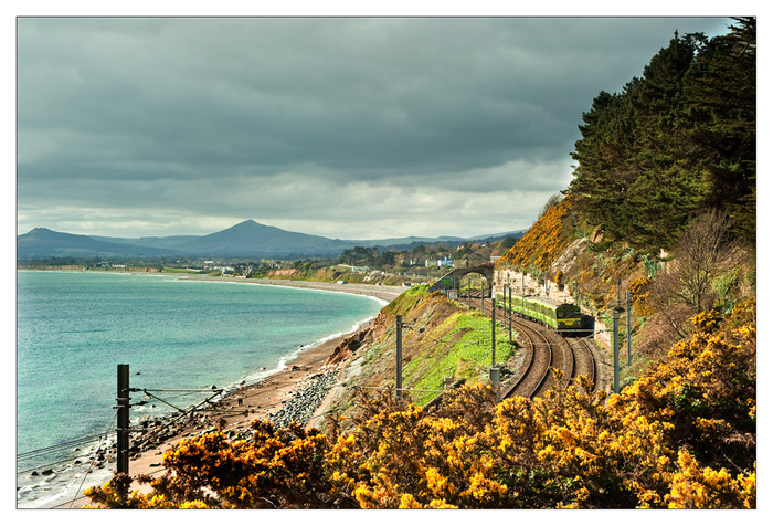 One of my earliest memories of a landscape photograph was in a calendar from Ireland by John Hinde. I have no idea really how old I was , but I do recall that I was not living in Ireland at the time and I thought that this photograph was really special and that Ireland was a lovely place. Being a john Hinde, it was of course very colourful with deep blue sky and ocean. Well today I had to go to Dublin and while there I took a trip out to Dalkey to visit my auntie. On the way I passed Killiney Bay and immediately recognized the view in that picture from long ago ! So I stopped to try and recreate it. Things have changed little in the forty years or so since I first saw that photograph, but some things have changed a lot. The scene is of course roughly the same , but in the John Hinde picture the colours are much more vibrant, the train is a diesel, orange coloured CIE train, and of course both the sea and the sky are blue!! There was no blue sky for me this morning and the train is now an electric DART and the view is spoilt a little by all the Electric overhead wires for the train!! I did a quick search of the internet this evening to see if I could find that original John Hinde photograph but to no avail .