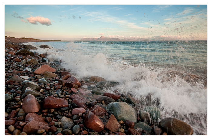 I did not get out with the camera today and was going through some pictures on the computer when i found this one. Its not the best picture I have ever taken, but I laughed because I certainly remember taking it . I was trying to capture the waves on the rocks with Croagh patrick in the background, well I suppose I succeeded but you might also notice that this little wave made a big splash and moments later I was seen scampering up the beach trying to dry both the camera and myself! The picture was taken on Mulranny beach.