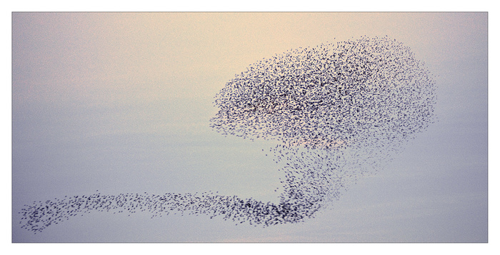 Returned from Cork today , so again spent a lot of time on the road. I arrived back in Mayo just after sunset and about fifteen miles from home I noticed a flock of starlings high in the sky . So I stopped the car and watched as they flew forward and back throwing all kinds of shapes! It was quite dark as the sun had already set, so I set the camera to iso2500 aperature priority and +1 exposure, with an 80 - 200 mm lens and took a number of pictures. Given those settings and the lack of light I was never going to get top quality pictures but I was happy with the results all the same. And I was entertained by them for about fifteen minutes.