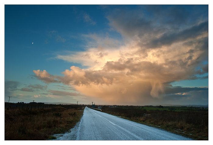 Yesterday morning I had to go to the airport to collect a visitor . the plane was delayed by half an hour due to the cold, I didn't mind as it gave me the opportunity to make the days picture! Firstly I was going to photograph the amazing sky but thought I should include the road to show how cold it was. As I was looking through the view finder it occurred to me that THIS is THE AIRPORT ROAD !!. I thought its great to live in Mayo we have a great airport in Knock but this must be one of the the quietest airport roads in the world!!