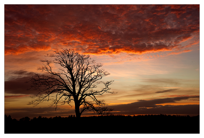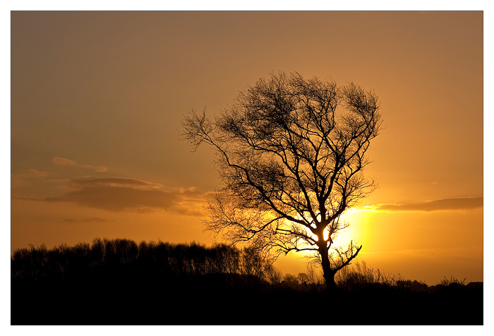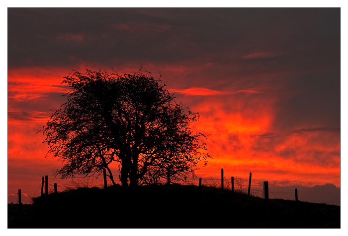 Yesterdays picture "gave itself up" but todays was a little harder got! It is taken just before sunrise yesterday morning. knowing the rain was coming I was out early in the hopes of getting a sunrise picture. There was heavy grey cloud with just a small area of sky low down and away in the distance showing some colour. Not really knowing where I was going I drove towards the orange glow, after ten minutes or so I found this tree with the glow behind it. I took a quick test shot to establish the correct exposure then put up the tripod and shot off three more exposures Suddenly the colour in the sky just disapeared. The sun never made it over the horizon!! As I drove home the rain started, and it poured all day long!!