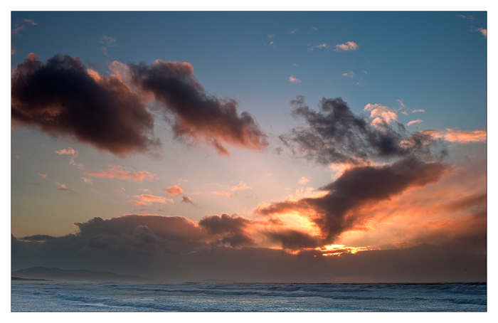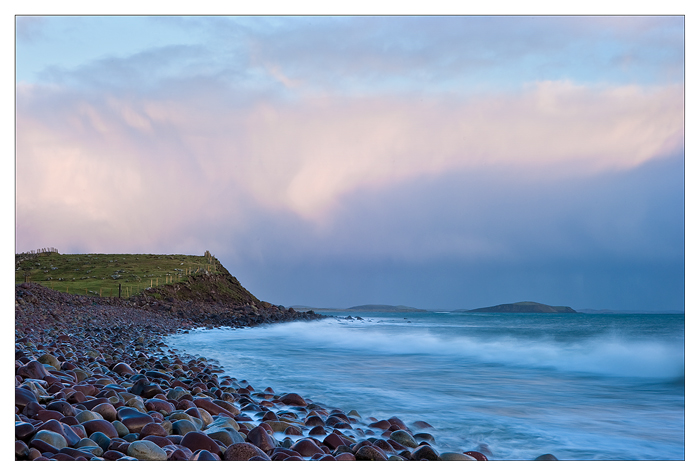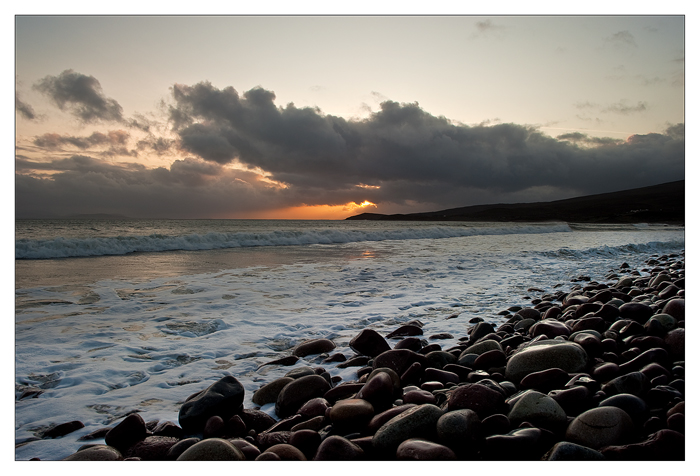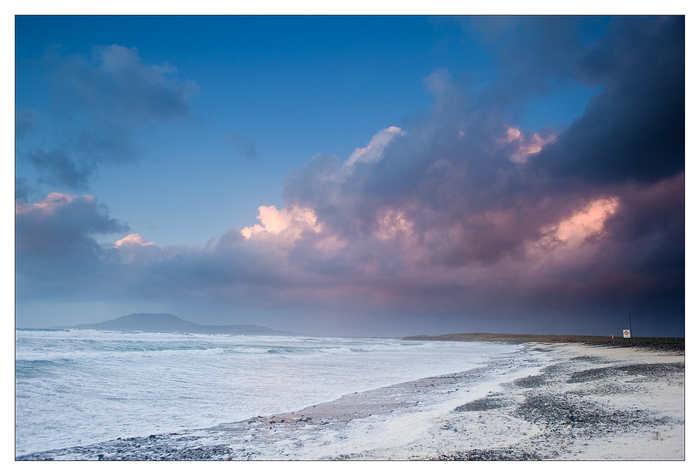 I am away in Cork for a couple of days.But I brought a couple of pictures with me!! On Thursday afternoon we had a bit of a storm with 100km winds. I had intended to go to the Cliffs at Dun Briste for a picture or two, but just as I left the house there was a warning on the news on the car readio. The newscaster said that met eireann were advising people to stay away from coastal cliffs!!!! Now I never heard such a warning on Irish news before so I thought I had better heed it, so I decided to try carrowniskey beach instead. I got there just as the sun went down, and the photo does not really do it justice! It was almost impossibe to stand up straight. Photography was very difficult because I could not hold the camera staedy, a tripod would be useless, So I had to turn the iso up high, and use a very wide aperature, both no nos in landscape photography, but on this occasion needed to get a shutter speed fast enough for the windy conditions. As it happens the clouds did clear for a few minutes while I was there and there was nearly a pretty sunset, but there were some lovely colours in the sky.