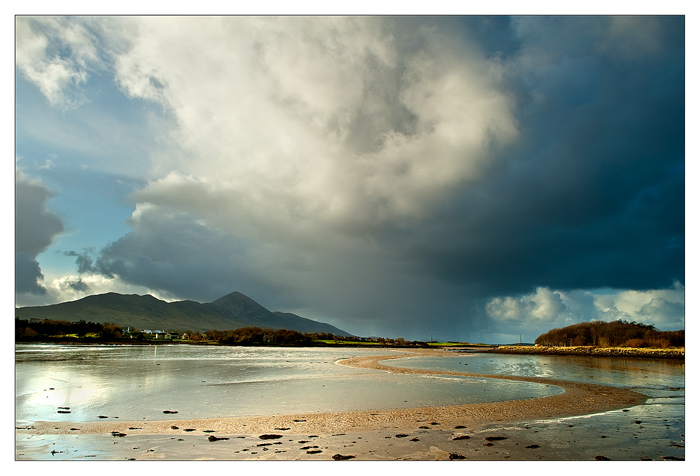 Its hard to believe we are in December again, I started this blog as a challenge for myself in December two years ago, It was easy for the first month or so after three months it became really hard. now after almost two whole years , the discipline of doing the daily blog has been well established, the problem is getting enough new images that are good enough to post. But sometimes the pictures just give themselves up, todays picture for example just happened in front of me. I was in Westport driving towards Murrisk when the low winter sun lit up the mudflats and the chocolate coloured channel . I grabbed the camera from the car, no time for a tripod, and took a few images before the shower you can see in the distance reached me and I beat a hasty retreat back to the car, knowing that the blog was covered for another day!!