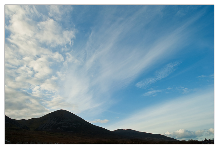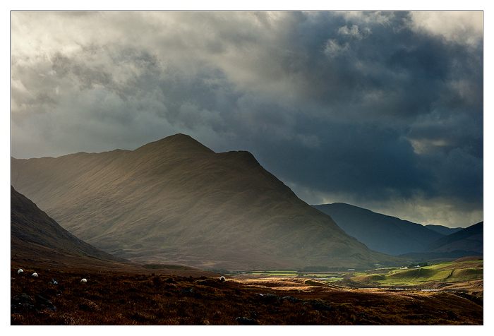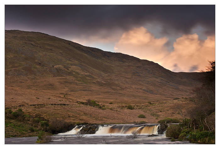 While pursuing the waterfalls yesterday, I had to keep an eye on what was going on behind me! The view across the valley is one of my favourites and the wind was so strong that the scene kept changing, with the sun only occasionally breaking through the clouds. To get to this location take the N59( from Westport to Leenane, stop just after the Errif Bridge there is the ruin of an old R.I.C. station (looks like a ruined cottage) Climb up the hill for great waterfalls, great ancient woods and superb views. Its like a little secret spot, well worth visiting.