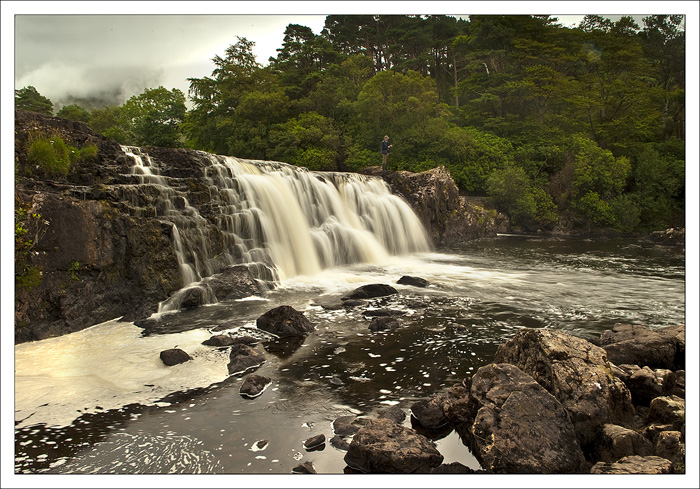 I really should not have complained about yesterday's blue skies !I was out early this morning to photograph St Mary's Abbey near Claremorris, I had visited yesterday early but the abbey could not be seen as it was completely covered in early morning fog, this morning there was no fog, just low cloud and absolutely no sunshine, the abbey just blended into the hillside behind it, i did not make a picture. Todays picture was taken several weeks ago and shows a fisherman, who actually caught a salmon at Ashleagh Falls.