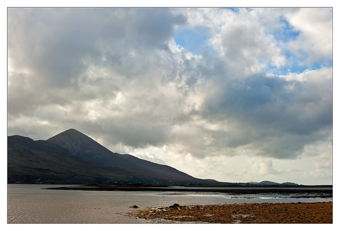 I'm late posting again today, I but I had a lovely day. I was teaching a one day course to a couple of people in Westport, most of the day was spent doing photoshop, both Kate and Liz were fairly new to photoshop but both took to it like ducks to water so we covered more then I expected which was great. Then in the evening I met with a couple of photographer friends, one of whom is putting a panel of pictures together for a photographic award, its always good to see other peoples work and this looked like a very good panel. I took this picture of Croagh patrick during a short break at lunchtime.