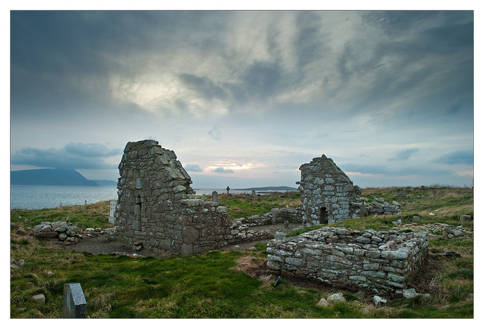Yesterday I continued my trip around the abbeys and churches. So I visited Killala, Doonfeeney near Ballycastle and St Deirbhiles Church on the very tip of the Mullet Peninsula . This picture shows the church and the saints tomb. After photographing the church I visited the Well of St Deirbhile a short distance away. There is a lot of folklore and traditions around the many holy wells and I was told that if you washed your eyes with the water from this well you would never go blind ! I dont normally pay much heed to these tales , but as I looked across at Achill Island I thanked God for my sight and thought a little wash of my face would do no harm!!