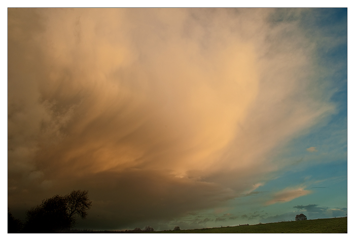 Only a couple of days ago I was chatting with my daughter about how much technology has changed our lives, not just in my lifetime but even in hers! We were talking about our iphones and all the wonderful things that can be done with them. So it was with sadness that I heard this morning of the passing of Steve Jobs who has contributed so much to that progress, and I also think of the vulnerability of man , that even one as successful as Steve Jobs can be taken so young. Todays picture of a huge shower cloud was taken about ten minutes ago, uploaded onto my Apple computer edited and shared with people all over the world !