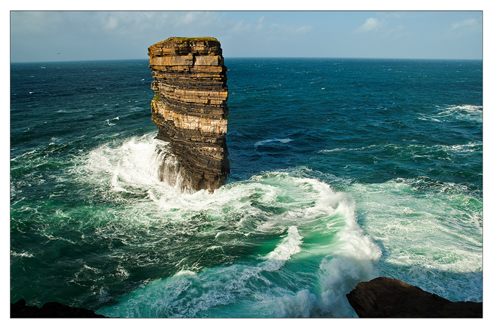 Despite the horrible morning we had yesterday the weather did improve in the afternoon so I decided to make a trip to Downpatrick Head as originally planned. It was fantastic because the wind was so strong and I arrived between showers , so it was lovely and bright . The sea was great! This sea stack just off Downpatrick Head is called Dun Briste ( Broken Fort)