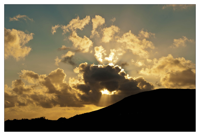 Another grey morning in Co Mayo, no sign of the sun at all! I had hoped to get out for some pictures this morning but its so grey its really not worth it. So back to the archive, or at least to a memory card still in the camera from last week. This picture was taken from the side of the road to Roonagh from Louisburgh. I thought the cloud looked like a dough nut with the "God beams" coming through the middle.