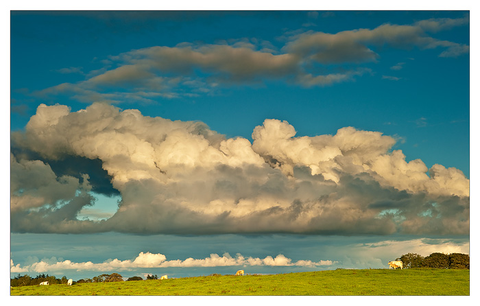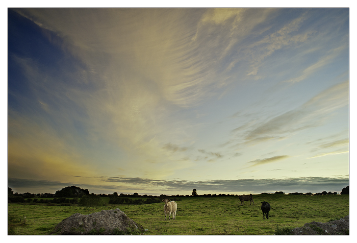 The last couple of evenings have threatened nice sunsets but each evening the sun has disappeared early and the sunset has been disappointing.The same happened yesterday as I drove to Claremorris, I was in a hurry and really did not have time to stop, but I could not resist a quick stop to record this sky. The three cows look completely shocked by my behaviour !!