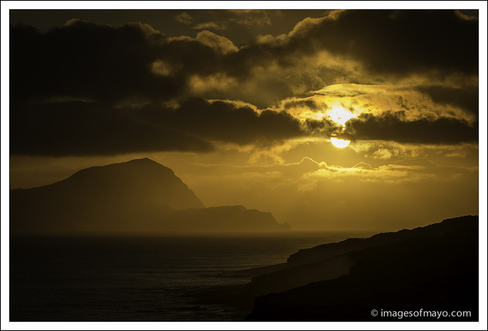Its blowing a gale and raining outside at the moment, so there was no sunset visible this evening, but here is a picture of the sun setting over Clare Island a few days ago