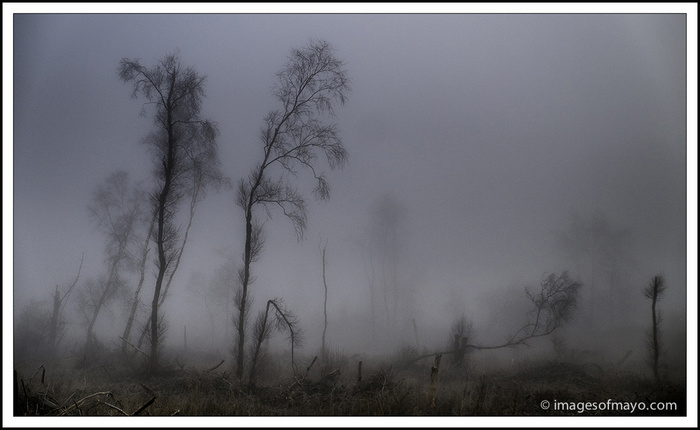 There is a parcel of land just outside Claremorris where some serious tree felling has occurred, I often think as I drive by that its a terrible mess and wonder how long before something is done with it. But I drove by on a foggy morning in January and thought it looked really interesting in the fog, so I stopped off for a while. The fog helps us to concentrate on the shapes of the small trees left behind, rather then the mess on the ground, they still look sad though!