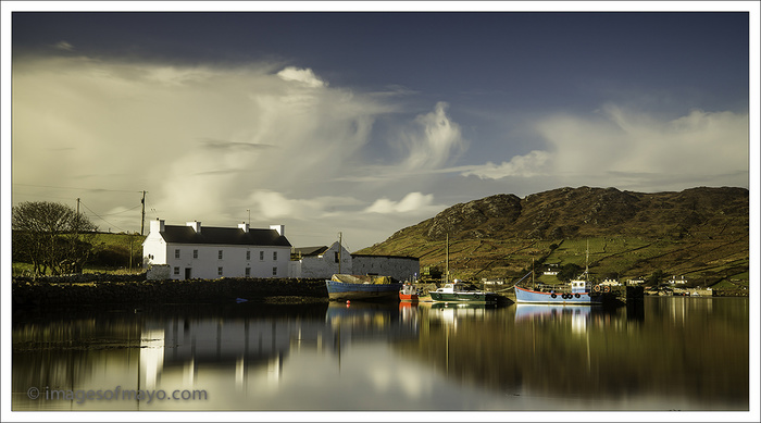 It is funny how we associate pictures with emotion. I have had this image ready for posting for nearly a month now. But every time I go to post it I shy away, because of the feelings I feel when I look at it. It is of a little harbour close to Corraun Village between Mulranny and Achill.I don't know the name of the harbour, but somebody might tell us. My hesitation in posting it though , is that while it is, I think, a nice picture it does not hold great memories for me !! It was, as you can see, a beautiful morning as Patricia and I drove past , and seeing the harbour from the main road I took Patricia on yet another detour. To get the water so smooth I used a Lee Big Stopper Filter in front of the lens ,to give a long 30 second exposure. The filter is just a piece of very dark glass that blocks out light, but they currently cost €127 in Ireland. Well, delighted with my efforts on taking the picture I removed the filter from the filter holder and inexplicably let it slip from my fingers, and watched as it shattered on the pebbles below!!! I have not been able to replace it yet! And of course almost every time I take my camera out since I see pictures that would work a treat if I had my big stopper!!!