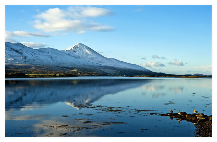 Winter has arrived in Mayo, Unusually early this year, we had our first snow last night and Crough Patrick was covered this morning. We only had maybe an inch of snow on lower ground and it melted quickly, though because we don’t get much of it we are never prepared, and there was traffic chaos ! I nearly added to it when getting this picture because I had to hang out the door of the car (which was stopped of course !) so as to keep the ducks in the picture, I had passed them ten minutes earlier but as soon as I appeared out of the car they flew away.