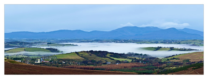 I was out early again this morning but the day started foggy and cloudy so I did not get the sunrise I had hoped for. As I drove into Westport I decided to get above the fog so went to the hills above Aughagower . You can see Aughagower church and round tower in the bottom left hand corner of the picture. The fog looks like water on the Landscape.