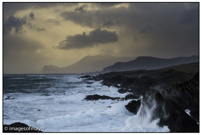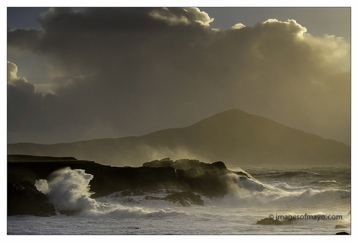 It is blowing up a storm outside as I write this. This evening I had to go to the hardware store, the nearest is on Achill Island so I headed off on my errand. When I had finished , and because it was blowing a gale,I decided to drive the extra ten minutes to Cloughmore to see the waves, it was raining and snowing as I approached but the sun broke through and for about ten minutes the light was just incredible, it was SO windy however that I was unable to stand to take the pictures!. I sat back into the car to take this one. Not bad from a trip to the hardware store, where else in the world could you combine such mundane task with such stunning scenery, they don't call it the " Wild Atlantic Way " for nothing!!