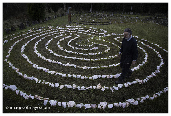 A little late posting today. The day was for the most part very cloudy and not great for landscape photography. But this afternoon I met with a very interesting gentleman. Ray Cooper lives just outside Kiltimagh and has embarked on a project to renew a small stretch of the Glore River, and has done amazing work clearing a long stretch of the river bank. But he also has built four labyrinths in his back garden. Here is a picture of Ray walking the labyrinth, it was taken late this evening with a high 1600 iso to allow for the lack of light.
