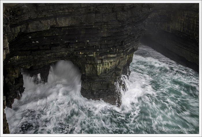 Had a great day today. Patrick a photographer from Co Cavan came for a one to one photography training day. Patrick has been a few times before so really does not need a lot of training, but wanted to practice some water pictures using slow shutter speeds to show motion and high speeds to freeze action. The weather when we set out in the morning was pretty awful, we had planned to get the sunrise on Mulranny beach but the sun failed to appear and we had to run from the rain. We travelled to North mayo however and visited Downpatrick Head , the sea at Dunbriste was wild, and it was not raining! So we spent a couple of hours at the cliffs, the power of the water was just amazing, as can be seen in this image as it crashed around the inside of one of the caves.