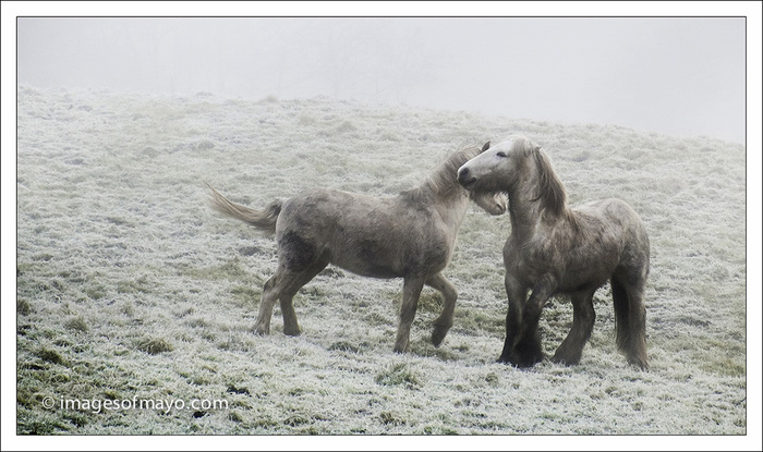 I got out for a short time early this morning. There was a very think fog, so i went looking for trees to concentrate on shapes, the fog was really thick and I got a few images that had promise. But on my way home I stopped to watch these ponies and got my favourite picture of the day. The ponies are a distance from me. I am using a 200mm lens but the fog has both softened the image and muted the colours, and I liked it enough to share.