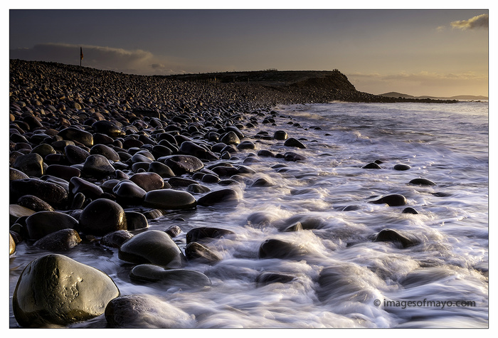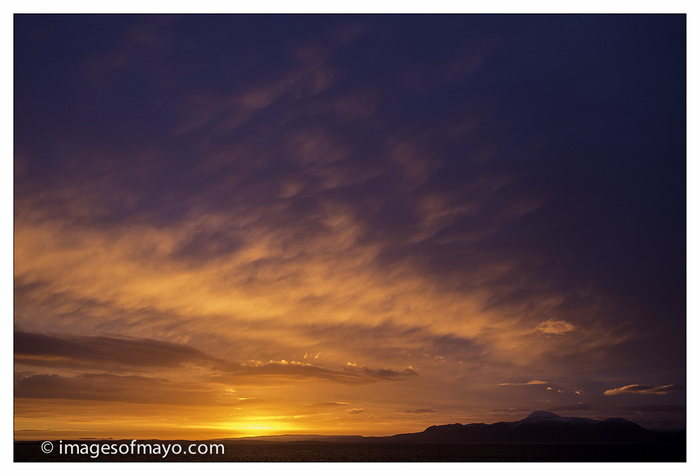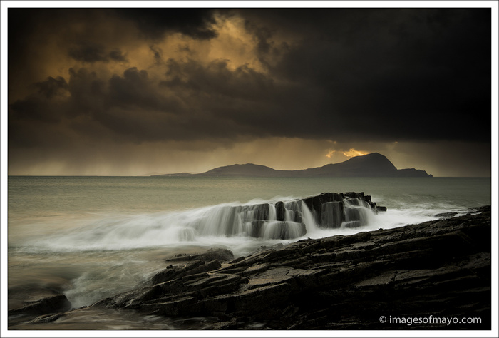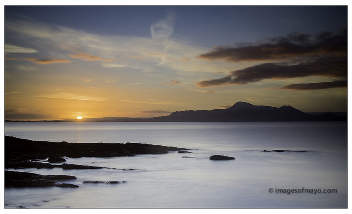 It was a lovely day in Mayo but with some very heavy hail showers . This evening I had made an arrangement to photograph the sunset with my friend and fellow photographer Colin. Colin arrived in Mulranny on time for us to have a cup of coffee and watch a particularly heavy fall of hail from the house before we headed out. It looked very unlikely that we would be successful in our quest for photographs as the clouds were very heavy and threatening. However we stuck to the plan and got to our destination on time for the sunset. however the sun did not actually appear, but it did its very best and this resulted in a dark scene but with lovely colours in the clouds. We had ten minutes or so of usable light before we had to find shelter behind rocks as the skies opened above us.