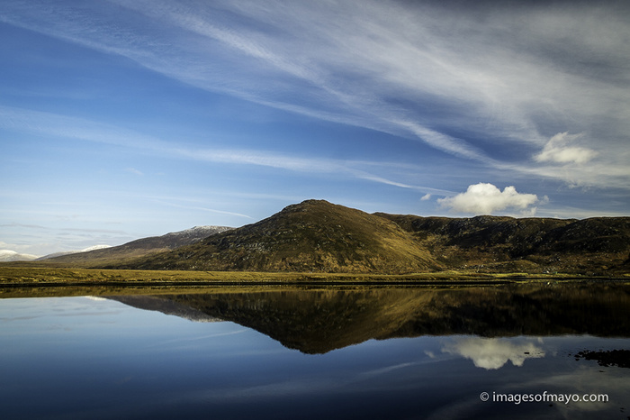 I usually like to shoot my pictures into the light, and generally avoid blue sky sun behind me kind of pictures. But sometimes you just have to take the picture, I was cycling with Patricia along the Great Western Greenway on Sunday afternoon when this view of Bellacragher Bay simply grabbed my attention. But sometimes its only when we stop that we really see things, after taking this image I noticed some movement in the water to the left of the scene and then spent ten minutes watching an otter, he was too small to photograph as I was too far away but it still felt like a privilege to watch him.