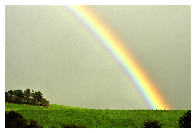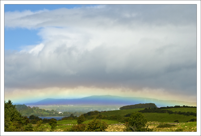 I was at the doctors this morning having suffered several days of what my wife Patricia dubbed “the man flu “, fortunately the doctor was a bit more sympathetic and anti biotics were issued!. I then drove to Westport to the gallery and nearly crashed the car between Castlebar and Westport when I looked to my right and saw the scene in todays photo. It all looked very strange, almost like a rainbow was being squashed by the big cloud above! I managed to find a place to pull the car off the road and ran back to get a viewpoint, the colours had already started to fade , I fumbled about with the exposures on the camera, but managed to shoot off a couple of frames before the colours faded altogether..