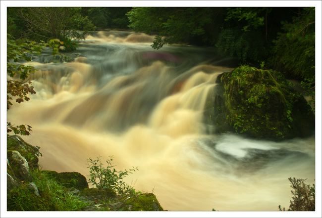 Today i was in the Gallery all day and it was by and large a lovely day weather wise. I was teaching a night class in Kiltimagh, and have been asked to run a second one on a Wednesday night as well. Anyway my only chance to use the camera was in the morning prior to opening the Gallery. When i set out the sky was very dark with no sign of the sun and so i decided after all the rain it might be interesting to photograph a waterfall. This one is a 5 or 6 minute drive from westport so I set off with half an hour to kill before opening the gallery. The river was in complete flood and very different from when I last photographed it (see blog on 31st July) . Anyway i had to work quick but just as I reached the riverbank the sun came out and hit the white parts of the water. Just what i didnt want but by the time I had set up the tripod and deecided on an exposure thankfully the sun disappeared I made a total of five different views and decided I had to pack up and open the Gallery. I was lucky i did because just as I reached the car the heavens opened, and I mean opened!!