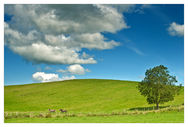 I took this picture a couple of days ago. I had composed everything and hoped the two horses would wander into the picture , the horses were out of frame to the left. I waited and waited but they remained out of shot. I did a few pictures without them and decided I could wait no more, I put the camera back in the car and had started the engine when suddenly the two horses galloped up towards the tree. I grabbed the camera and leapt out of the car ( well leapt may be an exaggeration ) and took three pictures as they ran back down the hill. I waited another ten minutes but they did not repeat, not even when I sat back into the car!