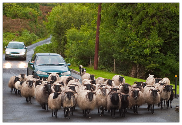 No real improvement in the weather but I just had to get out this evening . I photographed this stream at Furnace. It was a slow shutter speed of 90 seconds. When you take slow shutter pictures it takes as long to write the image to the memory card as it does to expose the picture. So I had just taken the waterfall when these sheep appeared to my right being driven by the dog and the farmer in his car. So I put the camera to my eye made several changes to the exposure to give me a faster shutter speed ,but the camera would not work until the previous picture was written to the memory card, I kept pressing the shutter butten and thought they would have passed me by the time it worked. Just when I was about to give up the camera started working.