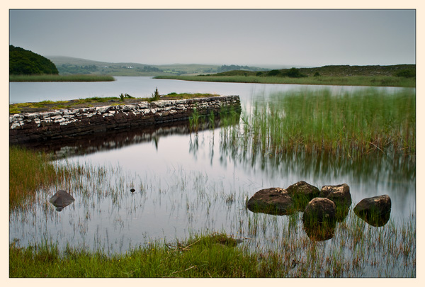 The depression that came over Westport yesterday continues and we have very dark skies and constant rain. I decided I had raided the archives enough recently and despite the "lack of light " I would go and get a new picture for today. Many photographers myself included talk about good light and bad light or on a day like today we would say there was "no light". But I believe you can make photographs in any kind of light you just have to choose your subject carefully. I decided today I would do a water picture and would use the lack of light to show movement. I went to Lough Furnace where there is a waterfall, but I was unable to get safe access to the waterfall so I will go back another time with company. Anyway I had a little wander through some woodland to the lackshore and came upon this little stone jetty. I imagined the photo in my head and went back to the car for the camera and tripod.When I was a youth I did a lot of fishing and when I found the jetty I thought it would make a great place to fish. It was raining and so when I took the tripod from the car I also took an umbrella and I really felt like I was going fishing, I remember wasting many an hour sat under an umbrella waiting for the fish to bite! For this photograph I used a very slow shutter speed of about two and a half minutes, well 151.7seconds to be exact!. This has resulted in the water becomming very smooth and the reeds bluring with the jetty and rocks remain still. I enjoyed taking it for all kinds of reasons.
