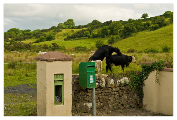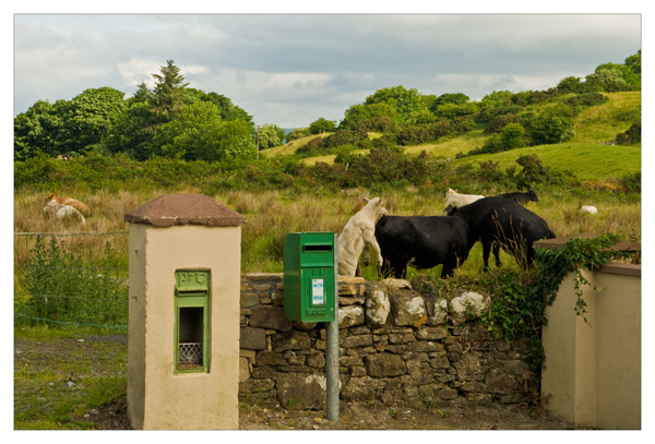 I stopped by the national school for two reasons, one to get the correct spelling for Barnacogue and secondly because I noticed the two letter boxes which I thought would make an interesting photo. There were some cows and calfs in the field behind and I tried to attract them over to the letter boxes by putting fresh grass over the wall. They would not come though and so I decided to take the picture anyway.