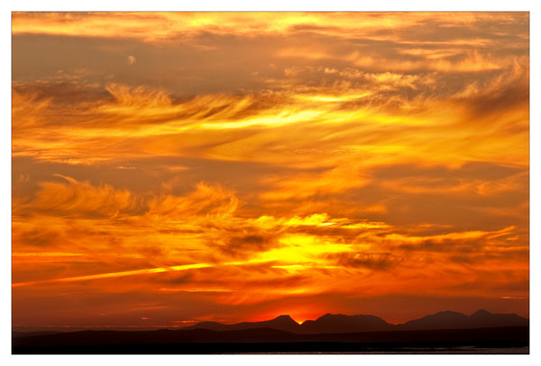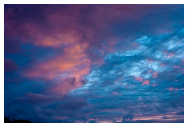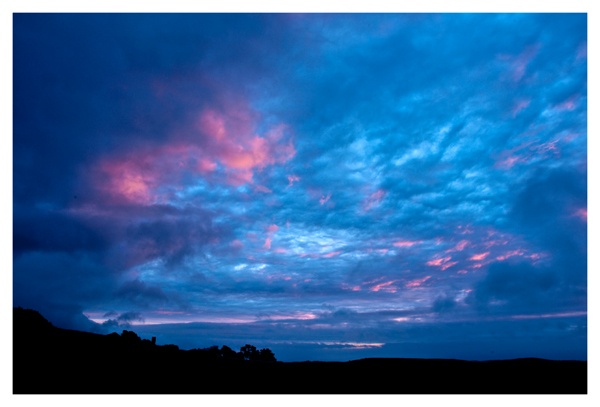 I was in the Gallery all day today and did not get out until about 5pm. Barry and I went and played nine holes of golf , of course I brought the camera. It was very windy and started to rain as we left the first tee. It poured and the wind became gale force. I never took the camera out of the bag. The weather continued like that all evening. We got soaked and the golf scores were not good enough to share with you. I had given up on getting a picture and had settled down in front of the TV when at 9.55 Patricia called me into the Kitchen and told me to look out the window. There was a very small break in the cloud and behind the grey there were the most amazing colours. I grabbed the camera jumped into the car and drove for two minutes to get to a good view point but even in that few minutes the colours began to fade. I grabbed a couple of pictures as the grey cloud moved in and the colour disappeared and within five minutes the whole show was over .