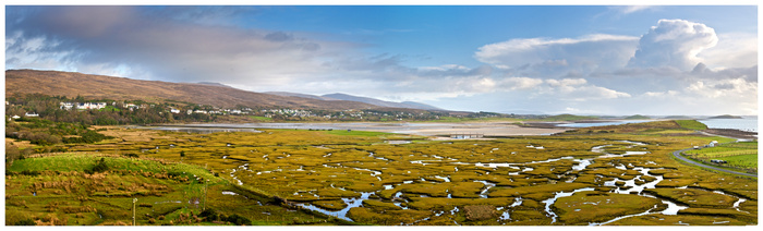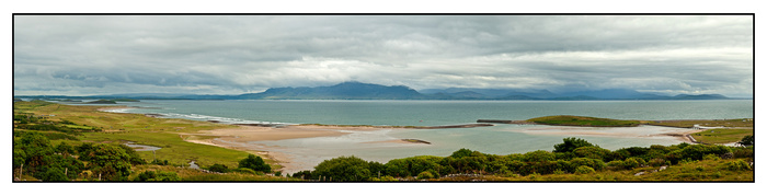 It rained today from early afternoon until late in the evening. I had to drive to Galway this evening and many roads were flooded - in July!! After the driest June in forty or fifty years we quickly forget what rain is like ! I dont think July will breack any records. I am posting a picture I made two days ago on my walk in mulranny. This view is taken from above the Railway Hotal. There are fourteen pictures stitched together to form a panorama. It is hard to see the detail in it on the web , because the image must be reduced so much for the internet. the actual file is 229 mega bites in size and when printed will be 2 meteres long! It was raining when this picture was taken as well, but the air was very clear with great visability, and I love the muted colours.