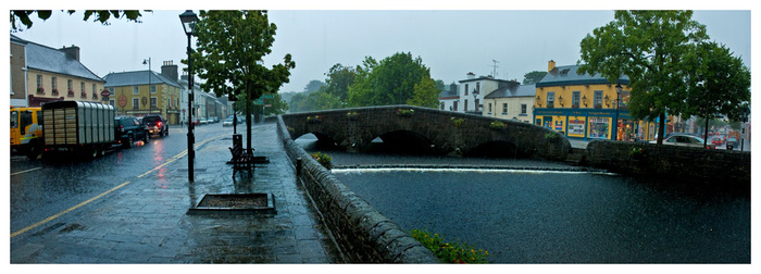 The rain this evening was unbelievable. It was so bad that having decided that there was no way I was going to get out with the camera, I had a sudden urge to get a picture anyway! So I captured this panorama of the mall inWestport in the rain in double quick time. I dont know what people in their cars must have thought as I stood in the rain.I was wearing a rain jacket and because I had no umbrella I had a second rain jacket held over my head and camera. I got soaked from the waist down! but managed to keep the camera dry. Due to the circumstances I had to use a wide apperture to get a shutter speed that I could hold (1/50 second)so there is not great depth of field. I dont think this would win any prizes in a summer photo comp!!