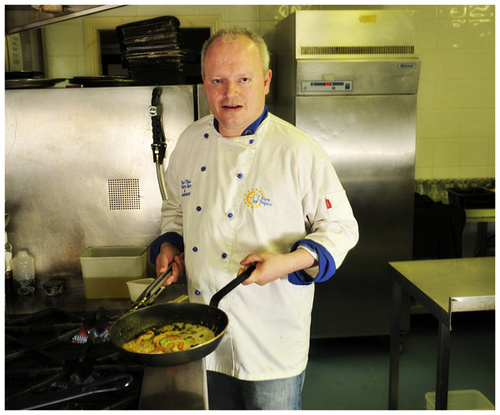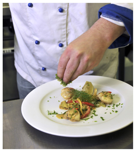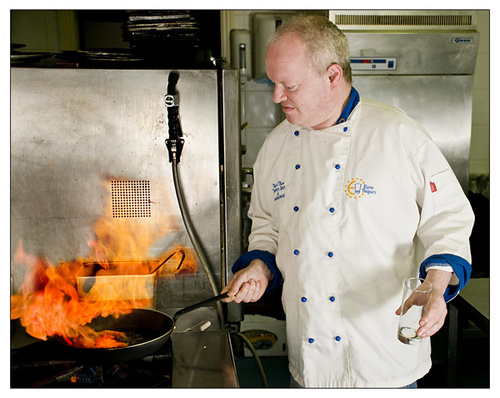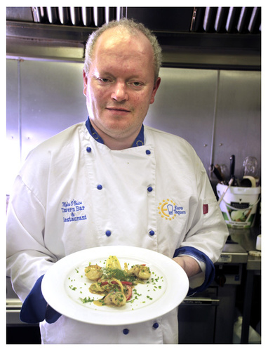 Myles is famous for his seafood. As I entered the kitchen all I could see was all those reflective surfaces, a photographers nightmare ! I had to work quickly as Myles has a busy restaurant to run, so I set up a couple of speed lights shooting through umbrellas to take away the flare. I think I got away with it. It was great to watch an artist at work! Miles cooked up a quick meal of scallops,