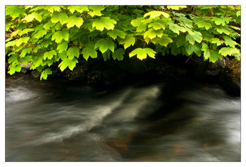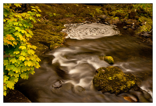 Following that I stopped at a river with small waterfalls on the way home. I was fascinated by one spot were bubbles on the water surface were turning very slowly in a circle, so I thought it would be nice to show the movement. I tried a number of different shutter speeds. It took 15 seconds to show the effect fully.