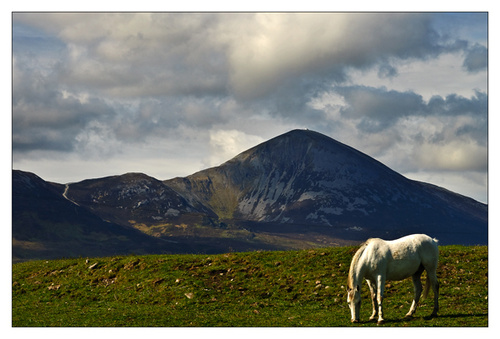 Today I thought of Dick quite alot. I went out at about 8.30 this morning, the sun was already very high and I really really struggled to see pictures !! Anyway after a little application I came up with these two, The first is of a pony with Croagh Patrick behind. The positioning of the pony was just right in relation to Croagh Patrick, accept of course that the pony is facing down hill. I recently was given a row by a man at a horse show when I attempted to photograph his champion mare and “ she facing down the hill”