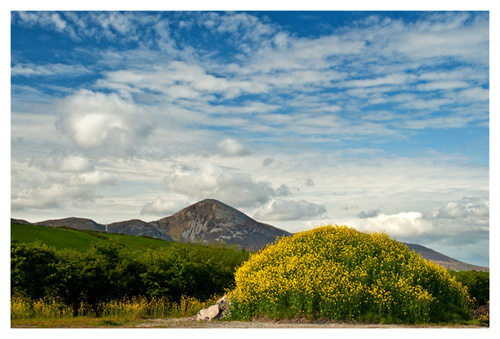 Anyway I drove on after the pony shot and noticed this mound of topsoil in the garden of a newly built house, the soil has been completely enveloped in rape seed, and its position in relation to Croagh Patrick made the mound look very impressive .