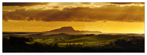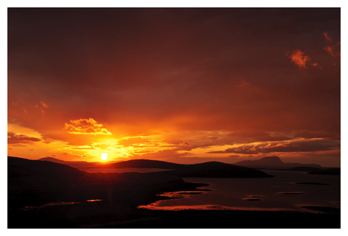 Got out for a few minutes late this evening and could see exciting light out on Clew Bay so went to a high point to try to capture the light. The sun was frequently disappearing behind clouds. It was when the sun was hidden that the most exciting light occurred as this caused very directional light as the sun broke through gaps in the cloud. I only had a few minutes to take this photograph which consists of three photographs stitched together, but it took a long time to process the image. Each image had to be processed twice so as to keep detail in the foreground while not blowing out the sky. Without doing this I would have had either a silhouette with no detail in the foreground, or alternatively detail in the foreground but no sky.