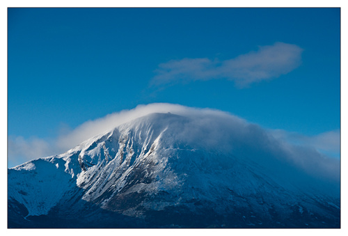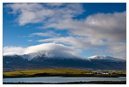 We had a lovely morning this morning. Croagh Patrick had a fresh dusting of snow and looked fantastic against the blue sky. I decided to photograph from Carrowcally on my way I watched the summit of the mountain and when I saw the church almost visible through the cloud I stopped and took a quick photo in case it didn’t appear again.