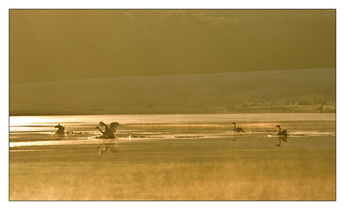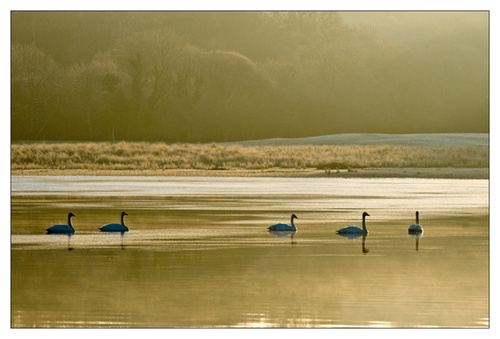 As I double checked everything I heard the call of the swan again from over my right shoulder, this time I did not need to turn around to see what it was, I simply grabbed the camera off the tripod, put the polarizer in my pocket, switched on the auto focus, switched the camera to aperture priority , set the aperture to 5.6 and set it to overexpose by one stop. All this was done in the blink of an eye! I now turned and as I put the camera to my eye I saw five, yes five, swans falling out of the sky, the lighting was magical, the sun was low and partly behind them there was mist on the water and they were coming in a formation the red arrows would have been proud of! This was a career making shot! I locked focus on the leader waited a further second or so for the right moment, as it approached, I was heard to say “YOU BEAUTY “ and I pressed the shutter button on my Nikon, my Nikon responded by saying “ beep beep beep ” for 10 whole seconds!!!! The self timer was still on!! The camera fired as the fifth swan hit the water!