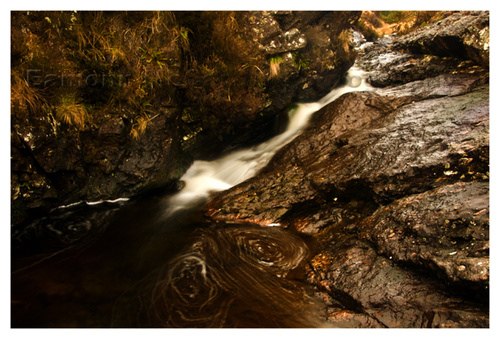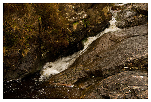 I was fascinated by the water, I noticed that a slow shutter speed resulted in bubbles at the base of the fall forming swirls, so despite the rain I took a number of pictures at various shutter speeds resulting in different swirls.