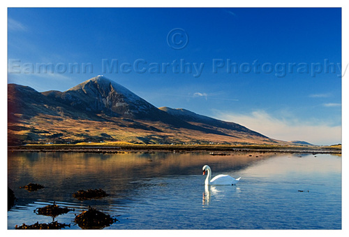 The tide was out and I had taken a few pictures when I saw this swan appear, I had never seen a swan there before and I immediately wondered how I could photograph it with Croagh Patrick in the background. I left my tripod and Camera bag were it was set up and walked about 150metres to my right, I walked to the waters edge but could not line the swan up with the mountain. I needed to be in the water, I was only wearing trainers but decided there was nothing for it only to wade in. So I did, the swan then co operated by turning back towards the mountain and the picture was in the bag. Despite the sun the water was freezing but I think it was worth it.