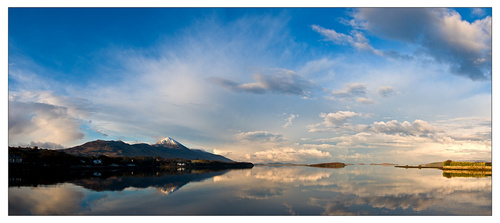 I drove out by Croagh Patrick but the weather closed in and I was caught in a shower. I began to drive back into Westport and the weather cleared as quickly as it had closed in and I had time to take this panorama picture before starting work in the studio at 9am!