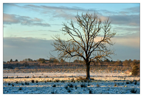 Its amazing how fast the sun rises and how quickly the light changes and the fantastic colours of the sunrise disappear . When I saw this second tree the colour had disappeared but I still stopped and waited for the rising sun to reach the branches of the tree. It was fifteen minutes before the tree was sufficiently lit for me to take the picture.